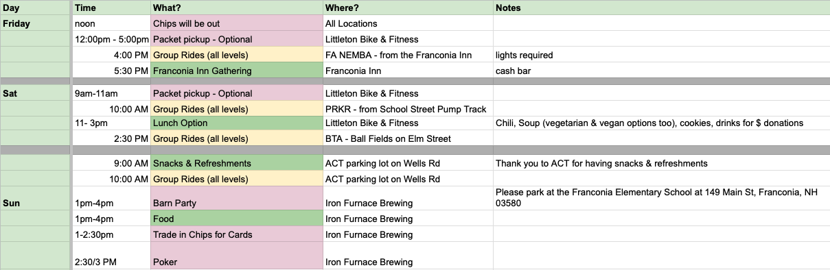 1-4pm on Sunday at Iron Furnace Brewing, we play poker at 2:30/3pm. Please park at the Franconia Elementary School at 149 Main St, Franconia, NH 03580. Your bikes will be safe there! Take the sidewalk around to Iron Furnace.